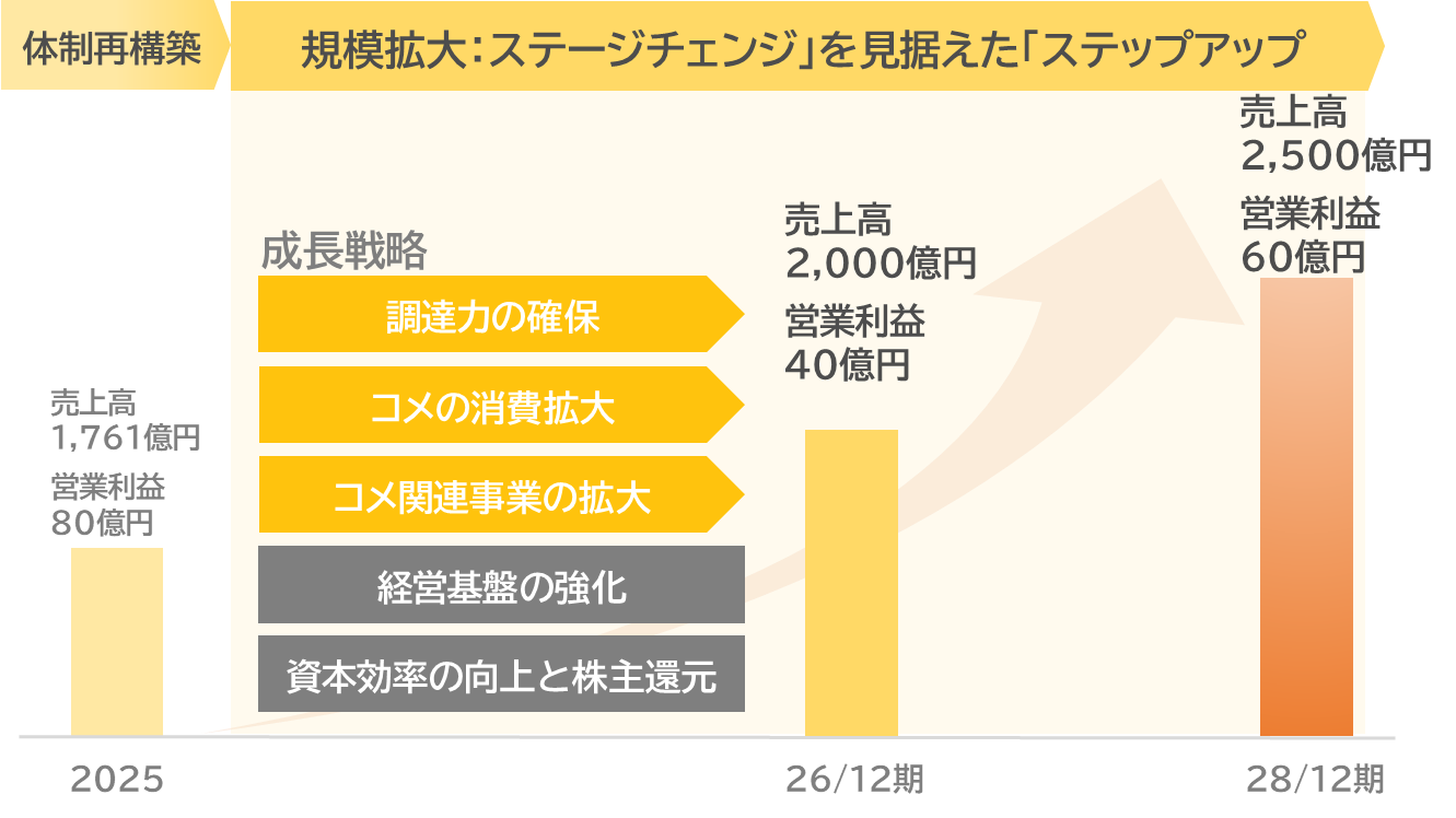 2026年から2028年までの3年間を「ステージチェンジ」を見据えた「ステップアップ」期間と位置付け、米穀卸からコメ食のインフラ企業へ進化するための基盤整備に取り組みます。最終年度の到達目標として連結売上高2,500億円、営業利益60億円を目指します。成長戦略として「調達力の確保」「コメ消費の拡大」「コメ関連事業の規模拡大」という3つの方針を掲げ、「経営基盤の強化」により成長戦略を支える体制を作りながら持続的成長に取り組みます。また、資本コストを意識した経営の実現に向け、「資本効率の向上と株主還元」に取り組みます。